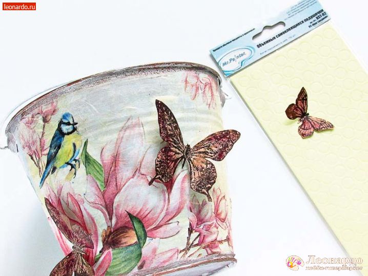 10. С помощью клеевых подушечек закрепляем на внешней поверхности ведра бабочек.