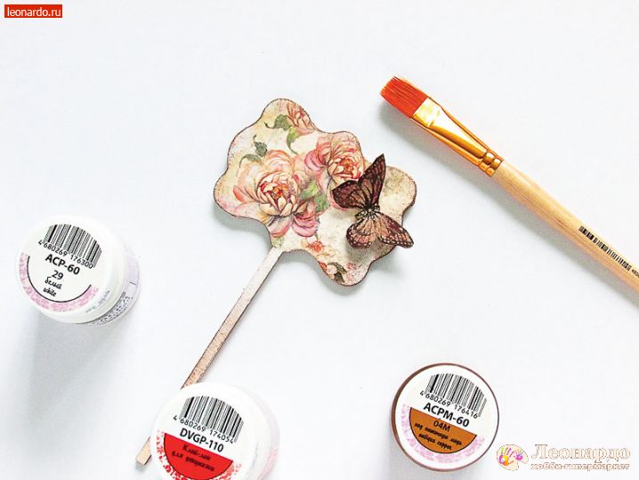 2. Вырываем элементы с подходящим рисунком из рисовой бумаги ручной работы Love2art (арт. KPR, 0023 «Цветы в саду») - она очень тонкая, но очень прочная - и приклеиваем клеем-лаком для декупажа Love2art (арт. DVGP-110) на внешнюю поверхность заготовки с помощью синтетической кисти. Дожидаемся полного высыхания.