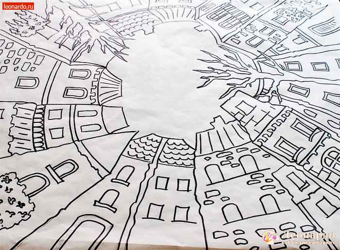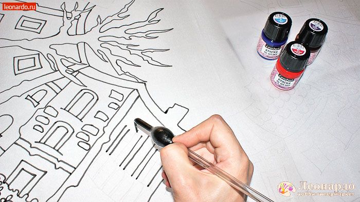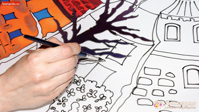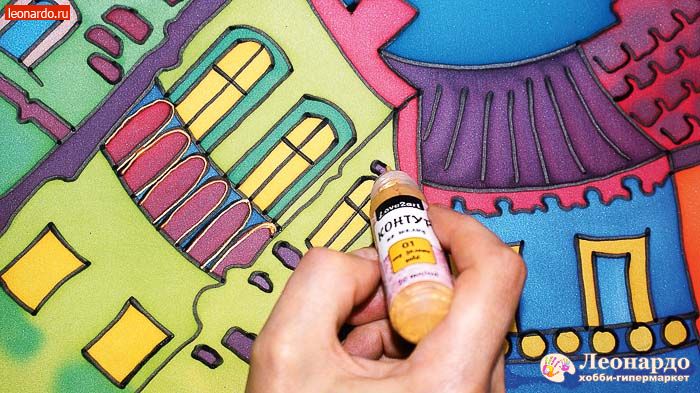 10. После высыхания красок, декорируем нашу работу золотым и серебряным контурами по шелку Love2art (арт. CLS-20, 01 золотой, 03 серебряный). Город становится более объёмным и нарядным.