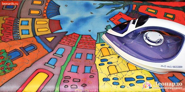 11. После высыхания контуров снимаем работу с рамы GAMMA и с помощью утюга закрепляем краски. Устанавливаем режим утюга в положение «хлопок» и с изнаночной стороны проглаживаем каждый участок росписи в течении 2-3 минут.