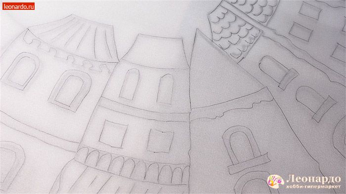 8. Когда все домики расписаны, можно приступить к нашему фону — небу. Смачиваем участок фона водой и наносим разбавленную водой краску Love2art лазурного цвета.
