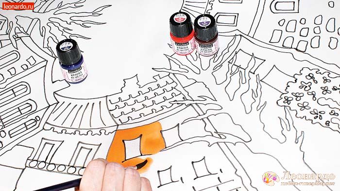 6. Для росписи используем краски по шёлку «батик» Love2art (арт. SIP-30, 02 солнечно-желтый, 03 оранжевый, 04 карминовый, 05 коралловый, 11 темно-синий, 13 изумрудный, 24 лазурный, 26 серый, 28 баклажан) и кисть Kinotti (арт. 10211-08, белка, круглая). Работу начнем с домиков. Стараемся расписывать от светлого тона к темному. Краску Love2art можно брать неразбавленную, а для более светлых оттенков следует разбавить водой. Различные оттенки можно получать, смешивая цвета между собой. Чтобы получить плавные переходы цвета, нужно сначала смочить участок водой. Акриловые краски Love2art быстро сохнут, и размыть их уже невозможно.