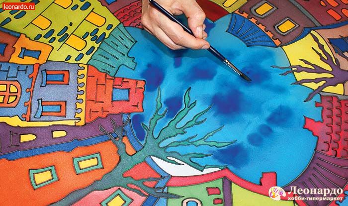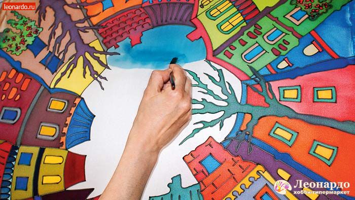 Платок с росписью в технике батик ― это броский и неповторимый аксессуар, который способен преобразить даже скучный повседневный наряд и добавить шарма своей обладательнице. Используя ткань для батика Habotai GAMMA из стопроцентного шёлка и специальные краски на водной основе Love2art, можно сделать эффектный платок с яркими домиками. Платок, расписанный вручную, выглядит дорого, а изображённый пейзаж напоминает вечернюю прогулку в уютном европейском городке, настраивает на романтический лад и поднимает настроение.