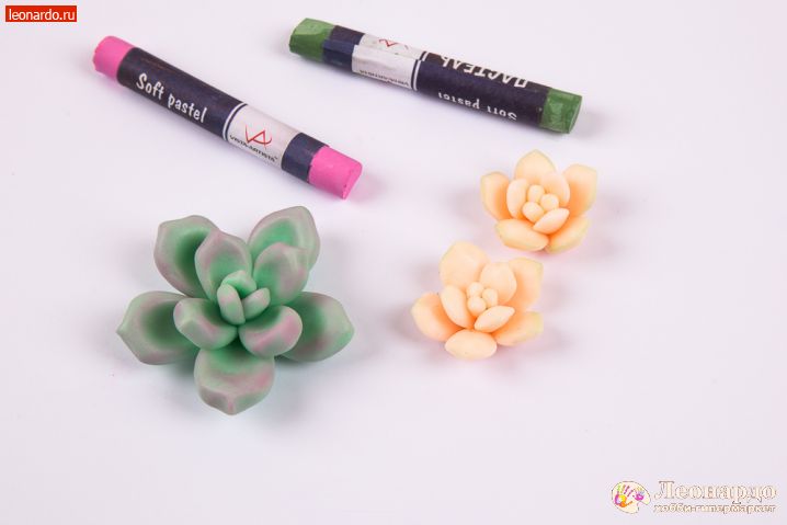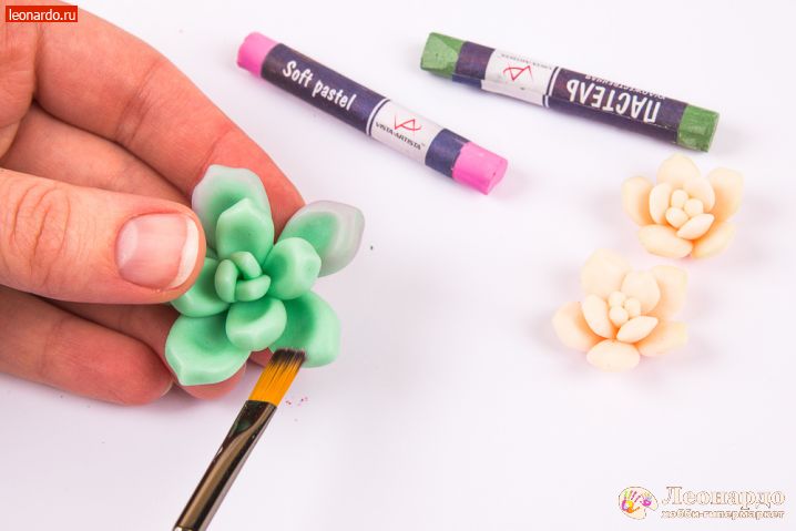 28. Чтобы цветы выглядели более реалистично, тонируем их сухой пастелью арт. VASP-24. Накрошите лезвием пастель розового и зеленого цветов. Сухой кистью VISTA-ARTISTA (арт. 50232-06 №06) пройдитесь по краям лепестков: розовым цветом - по зеленому суккуленту, зеленым – по персиковому.