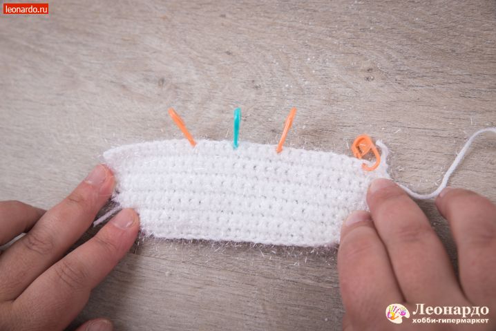 5. Берём маркировочные кольца для вязания с замком GAMMA (арт. MKL-20). Отмечаем середину вязаного полотна на 13 - сбн (бирюзовый маркер). Отмечаем 2-й сбн справа и слева для красной дуги радуги.