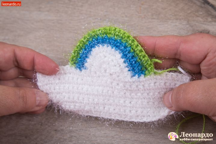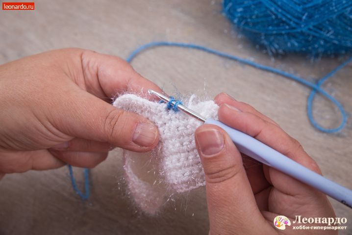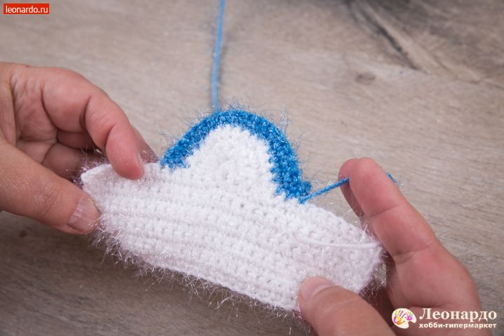 5 ряд - вяжем пряжей голубого цвета по полукругу до конца ряда и делаем прибавки через 4 петли. Нить обрезаем.