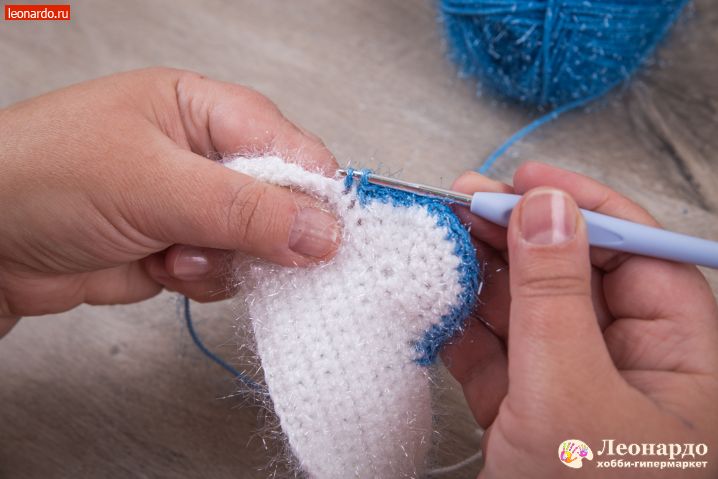 4 ряд - берем нить Adelia «BRILLIANT» №08 голубой. Вводим справа в следующую петлю основного полотна и протягиваем ее, захватываем нить и провязываем первый сбн.