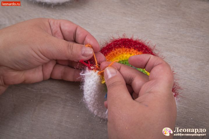 32. Отрезаем 20 см пряжи красного цвета, вставляем в иглу и сшиваем красные стороны мочалки, оставив отверстие для выворачивания.