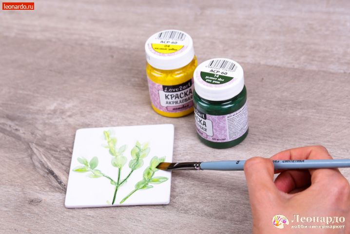 7. Раскрасим готовые плитки красками Love2art (арт. ACP-60, 04 желтый, 14 зеленый), смешивая их, чтобы получить нужный оттенок.