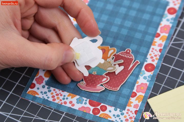 5. Чашки с чайниками из набора чипборда Mr. Painter (арт. CHI-15) зафиксируем в нижней части малого прямоугольника на клеевых подушечках Mr. Painter (арт. DST-01).
