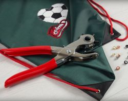 С помощью универсальных щипцов-пробойника Micron вы с легкостью сделаете аккуратные отверстия с металлической окантовкой, в которые будет удобно продеть шнурок. Например, таким образом можно оформить мешок для обуви. Смотрите видео и экспериментируйте!