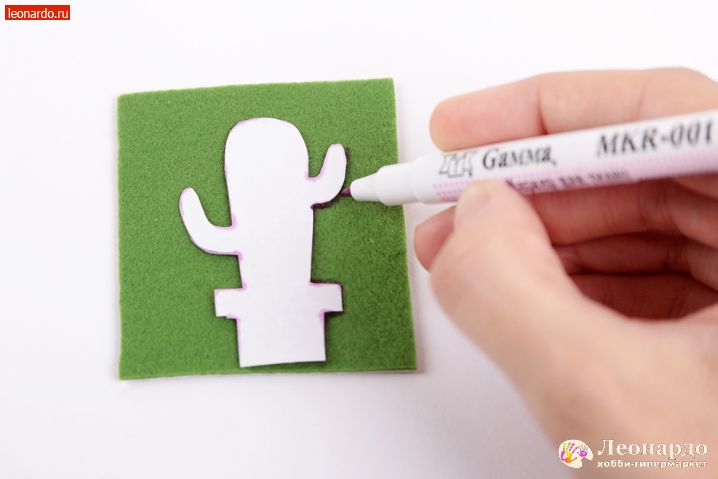 1. Переведем контур кактуса на фетр GAMMA Premium (арт. FKS12-33/53, №865 св. зеленый), обведя шаблон самоисчезающим маркером GAMMA, арт. MKR-001 (фиолетовый).
