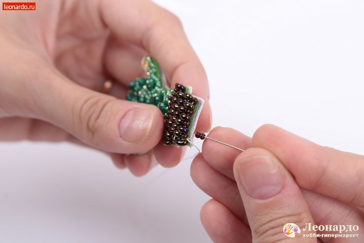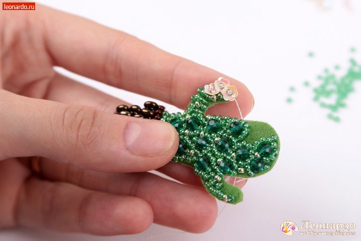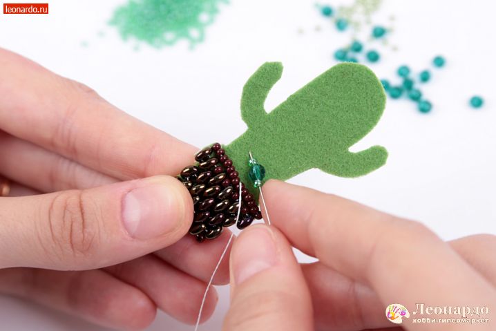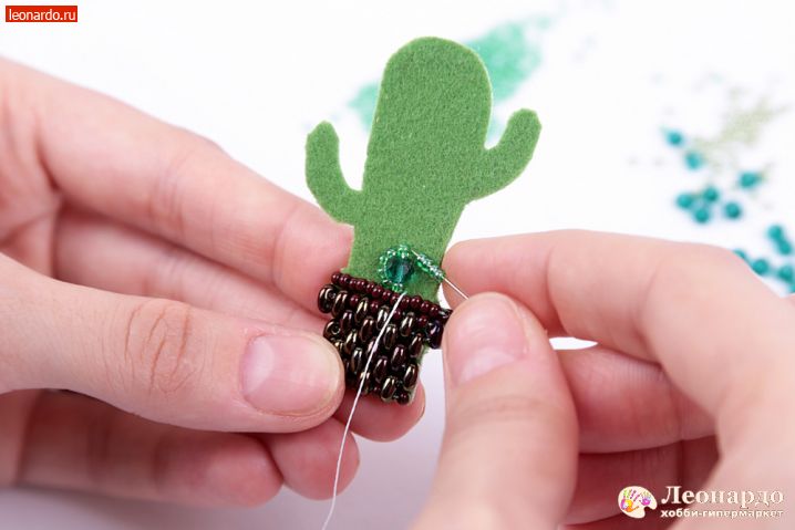 16. Сам кактус будем обшивать бисером GAMMA (круглый 2 10/0, B108 зеленый). Можно добавить несколько «колючек». Для этого наберем три бисерины: 2 зеленые и 1 бледно розовую и пришьем к контуру.