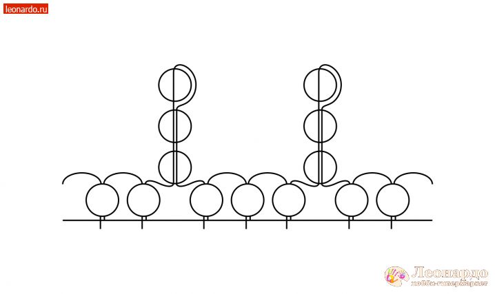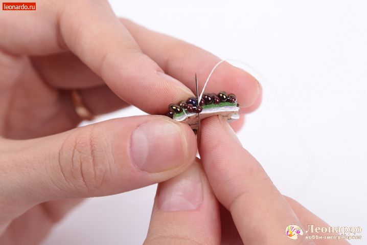15. Осталось обшить брошь. Начнем обшивку с горшка темно коричневым бисером по схеме. Сначала набираем 2 бисерины, иглой захватив фетр и пробку. Далее входим иглой снизу вверх в одну бисеринку. Вторая пока будет выглядеть несколько криво, но когда мы будем замыкать бисерный контур, это исправится. Затем набираем еще одну бисерину и идем дальше, обшивая край по 1 бисерине. Бисерины должны располагаться отверстием вверх.