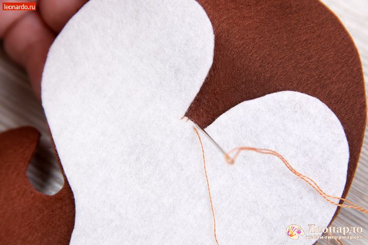 18. Соединяем две детали туловища изнаночными сторонами, совмещаем срезы и сшиваем вручную «петельным» швом. Используем для этого иголку и мулине коричневого цвета.