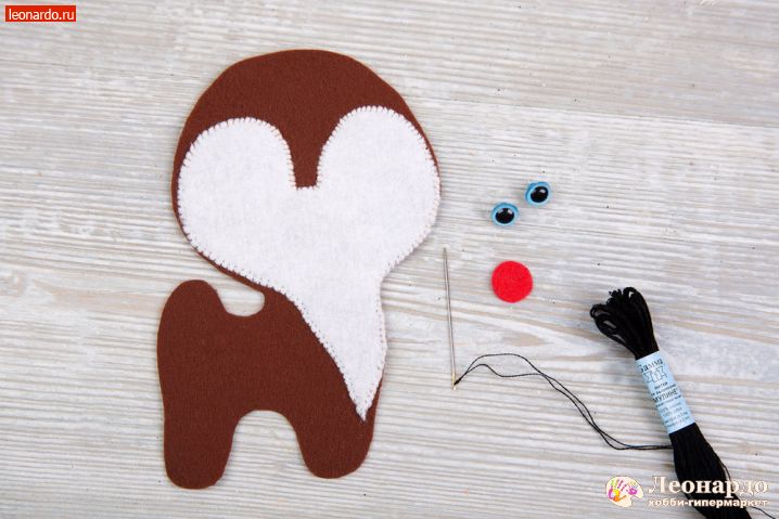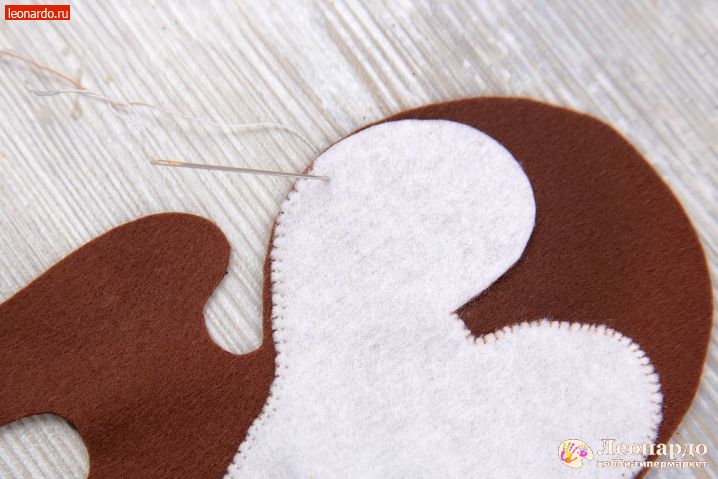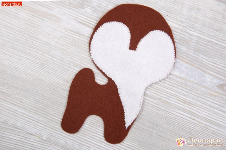 5. Приступаем к пошиву игрушки. Сначала швом «через край» пришиваем вручную белую деталь мордочки оленёнка к туловищу. Шить начинаем из центральной точки мордочки. Для шитья используем иглу из набора GAMMA (арт. N-310, №3-9) и нитки мулине GAMMA (меланж, арт. Р-19 св. коричневый-белый) в одно сложение.