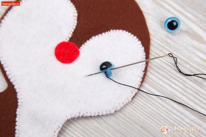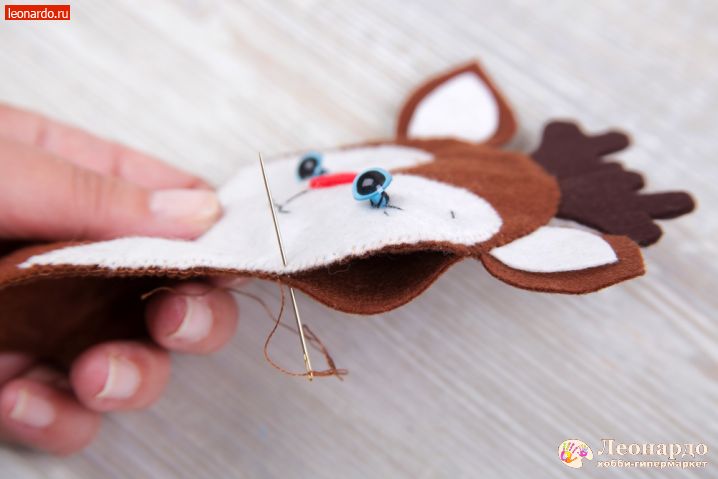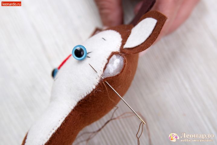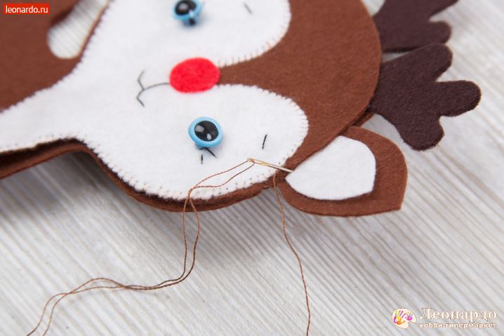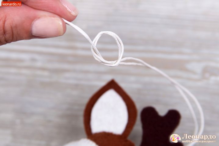 25. Отрезок вощеного шнура складываем пополам и при помощи иголки и нитки мулине фиксируем между рожками оленёнка. Для прочности делаем несколько стежков. Это будет подвес для нашей игрушки.
