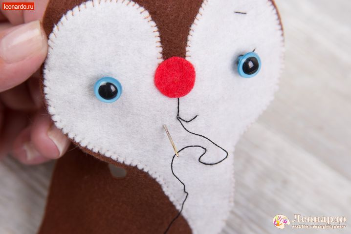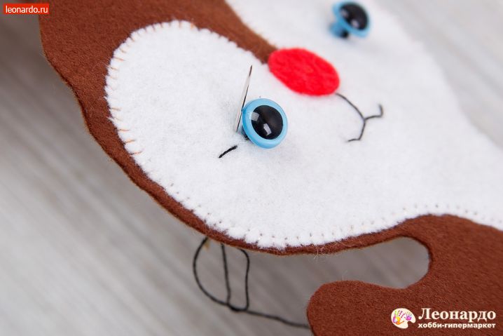 13. Вышиваем оленёнку ресницы и брови. Для этого рядом с каждый глазом делаем нитками мулине два коротких стежка и один стежок над глазом – это бровь.