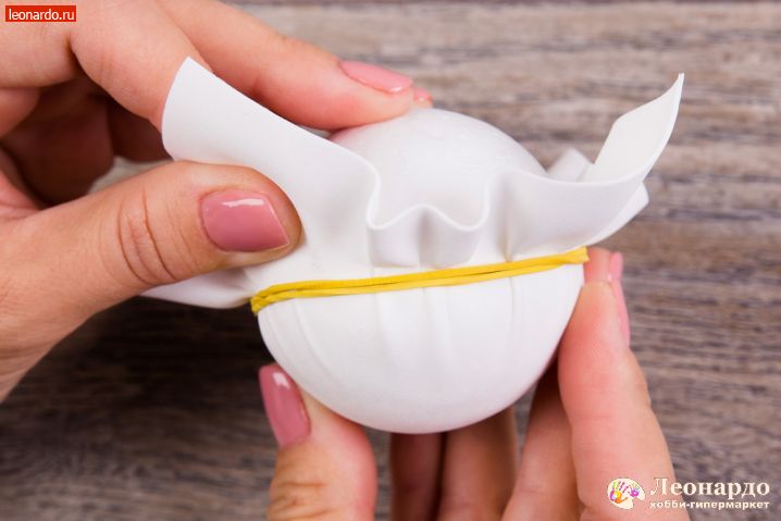 2. Располагаем шар по центру квадратной заготовки. Края фоамирана поднимем вверх и фиксируем на шаре с помощью банковской резинки. Расправляем фоамиран по линии резинки. Получившиеся складки осторожно подтягиваем с внешней стороны. При необходимости можно несколько раз пройтись по кругу, постепенно уменьшая глубину и количество складок. Главное, не допустить разрывов этого эластичного, но тонкого материала. Если это всё-таки произошло, вырезаем новую квадратную заготовку и начинаем процесс обтягивания шара сначала.