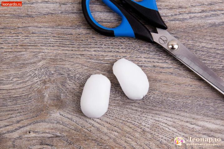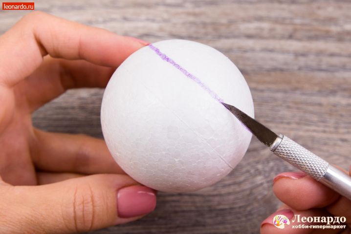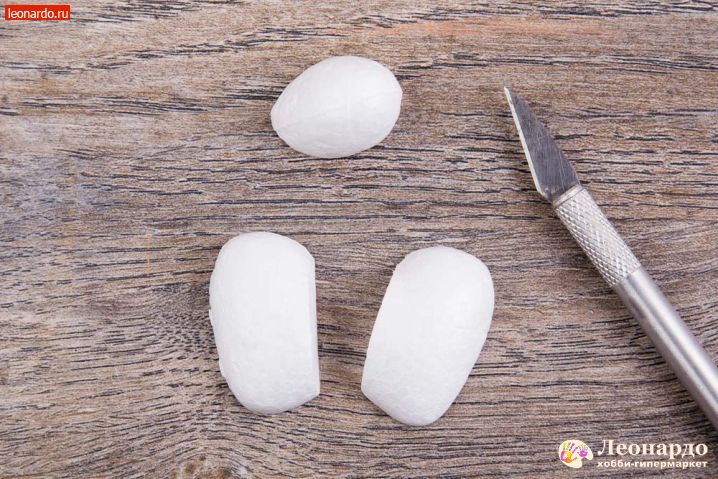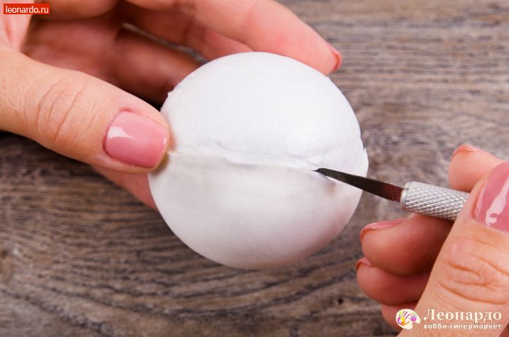 28. Для изготовления туловища отрезаем от пенопласстового шара диаметром 6 см примерно 1/3 часть.
