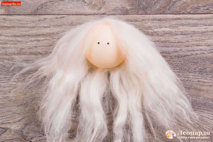 7. Прическу куклы выполним из мохерового тресса HobbyBe (арт. HAR/M) светлого оттенка - для прически на нашу куклу достаточно 1 метра. Первый ряд волос приклеиваем по кругу встык к белой полоске, прикрывающей фоамиран.