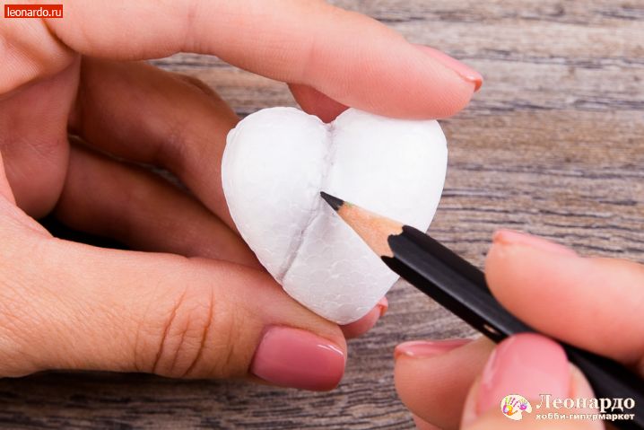 9. Для изготовления валенок используем пенопластовую заготовку в форме сердечка Love2art (арт. DPZ-02, №02). Карандашом VISTA-ARTISTA ACADEMIA (арт. VAPN-010) наметим от центра косую линию так, чтобы правая часть была ровной. Точно такую же линию наметим с обратной стороны сердечка.
