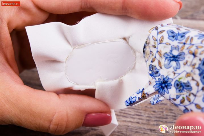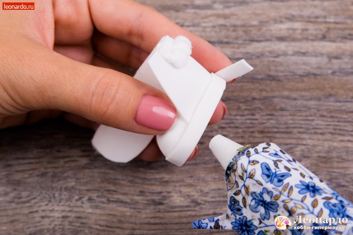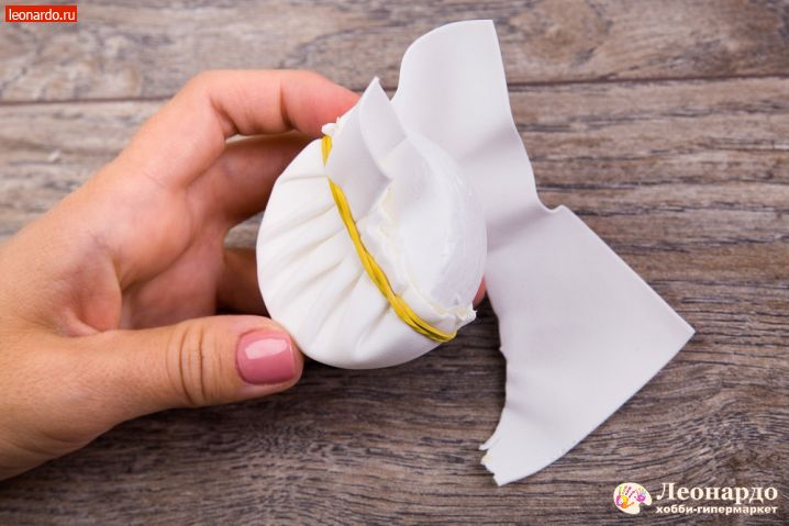 29. Большую часть обтягиваем квадратной заготовкой из фоамирана размером примерно 12х12 см (см. п.1-4). С плоской стороны можно заложить ровные складки. С помощью клеевого пистолета приклеиваем фоамиран к пенопластовой заготовке над резинкой. Лишний фом обрезаем, резинку можно снять.