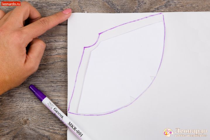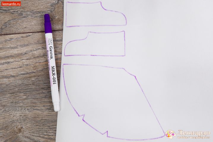 17. На лист белого фоамирана наносим контуры платья и обуви с помощью самоисчезающего маркера GAMMA (арт. MKR-001, фиолетовый). Детали обуви должны быть симметричными. Вырезаем заготовки по контуру.