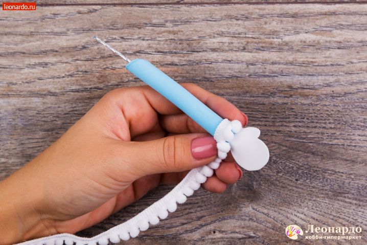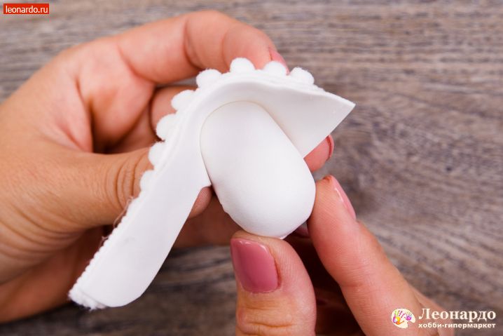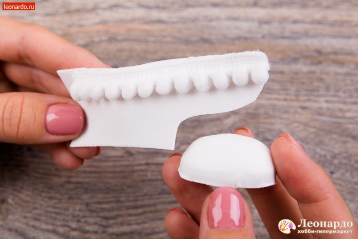 18. Белую тесьму с помпонами BLITZ (арт. FBL-04 10) приклеиваем клеевым пистолетом вдоль заготовки для обуви, отступая от широкого края примерно 0, 7 мм.
