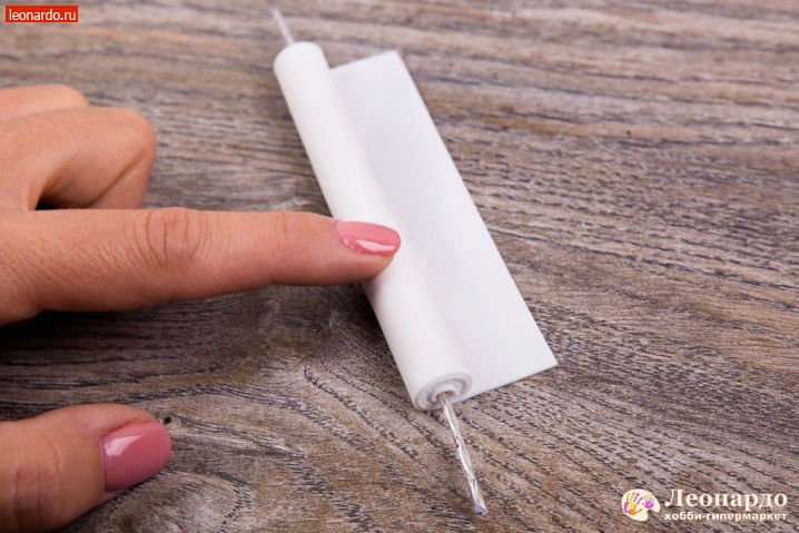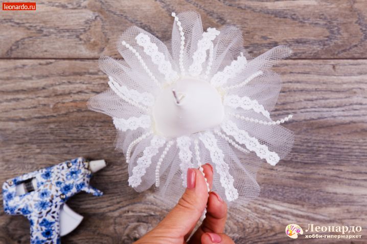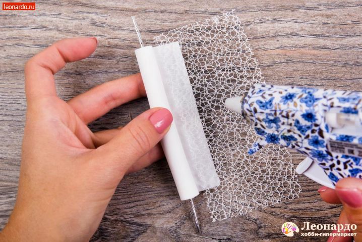 23. Заготовку из фоамирана как можно туже закручиваем вокруг проволоки, оставив свободным край примерно 1,5 см. К свободному краю шириной примерно 1,5 см с помощью клеевого пистолета приклеиваем кружевное полотно.