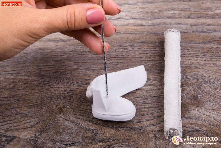 26. На проволоку снова нанизываем белую заготовку ноги. Приклеиваем ее в нижней части к валенку. Следим, чтобы стык фоамирана на ноге оказался сзади. Фигурный клапан оборачиваем вокруг ноги и приклеиваем к внешнему краю валенка.