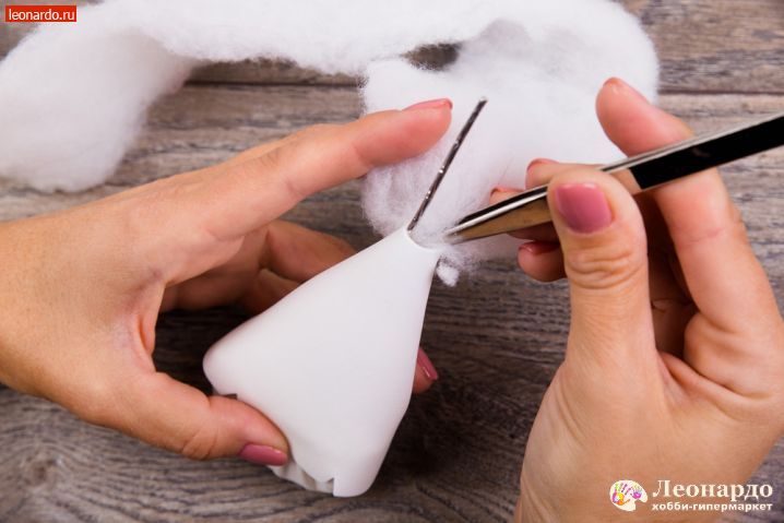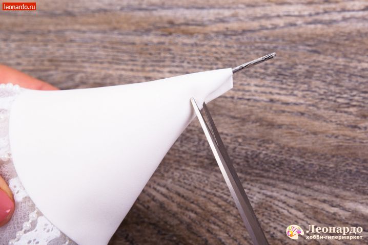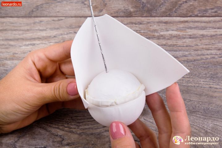 30. Для тела куклы отрезок проволоки длиной 12 см вставляем вертикально в центр пенопластового шара. Оборачиваем шар с проволокой конусообразной заготовкой из фоамирана. Края заготовки склеиваем на спине. Набиваем тело куклы с помощью пинцета GAMMA (арт. SS-003) синтетическими шариками.