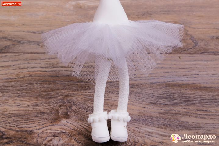33. Полоску фатина (арт. FTN) длиной 80 см и шириной 15 см складываем по длине и собираем на нитку. Располагаем юбочку на талии куклы.
