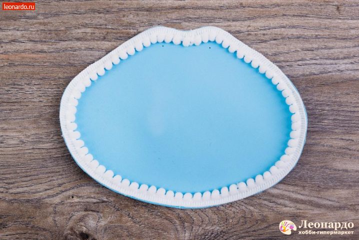 39. Из голубого фоамирана Fiorico (арт. EVA, №21) вырезаем заготовку шубки. Декорируем по краю тесьмой с помпонами.