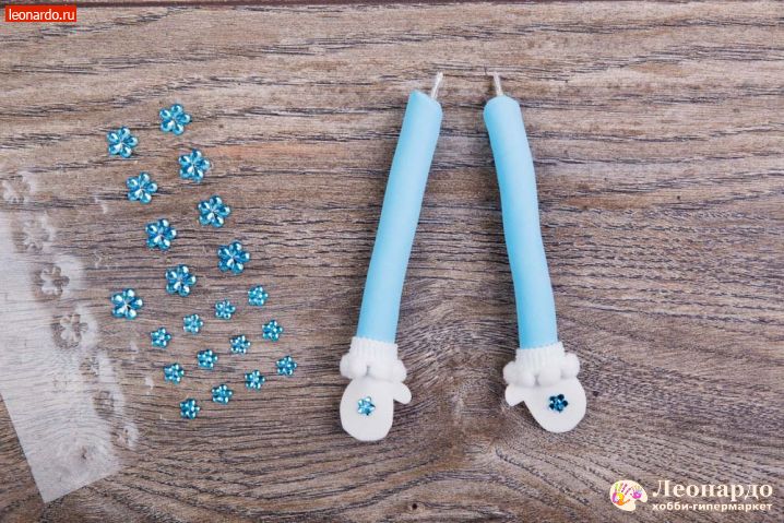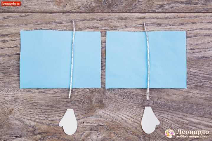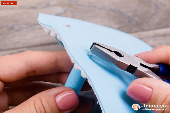 43. Вставляем проволоку в трубочку из голубого фоамирана (с прямого края). Приклеим и украсим тесьмой с помпонами. Аналогично выполним вторую руку. На варежки наклеим декоративные элементы Mr. Painter (арт. ARNT-11, №02 голубой).
