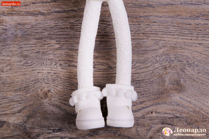 26. На проволоку снова нанизываем белую заготовку ноги. Приклеиваем ее в нижней части к валенку. Следим, чтобы стык фоамирана на ноге оказался сзади. Фигурный клапан оборачиваем вокруг ноги и приклеиваем к внешнему краю валенка.