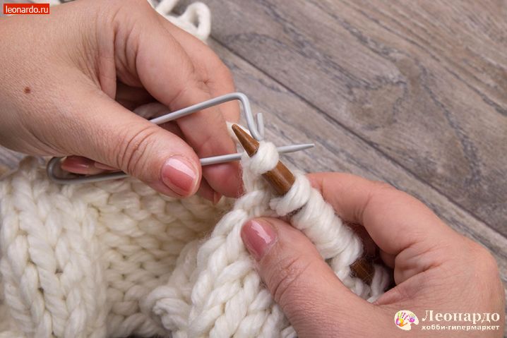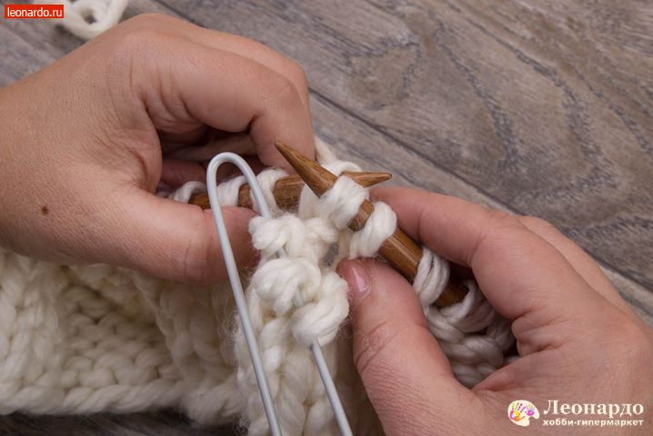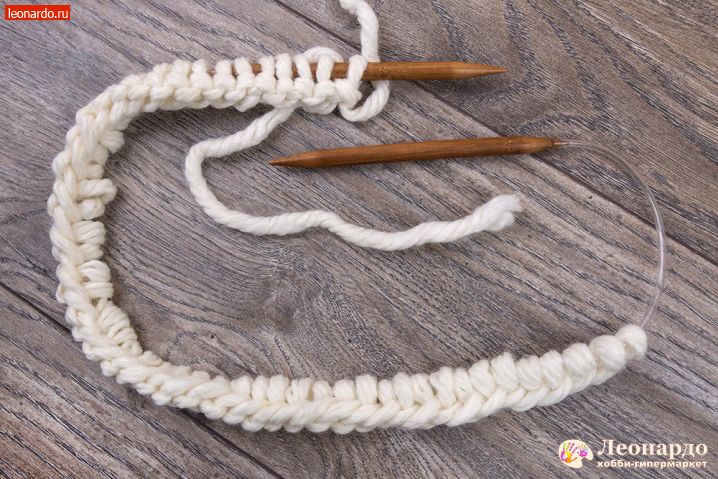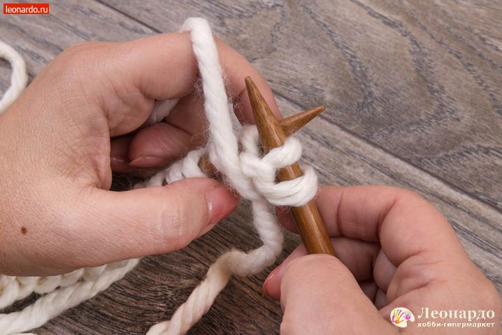 1. Делаем набор петель на спицы GAMMA (арт. BC-D d 9.0 мм 80 см карамельные) белой нитью ADELIA "FAST" (78% акрил, 22% шерсть, №02). Для вязания снуда нам потребуется 50 петель, около 1,5 метра нити