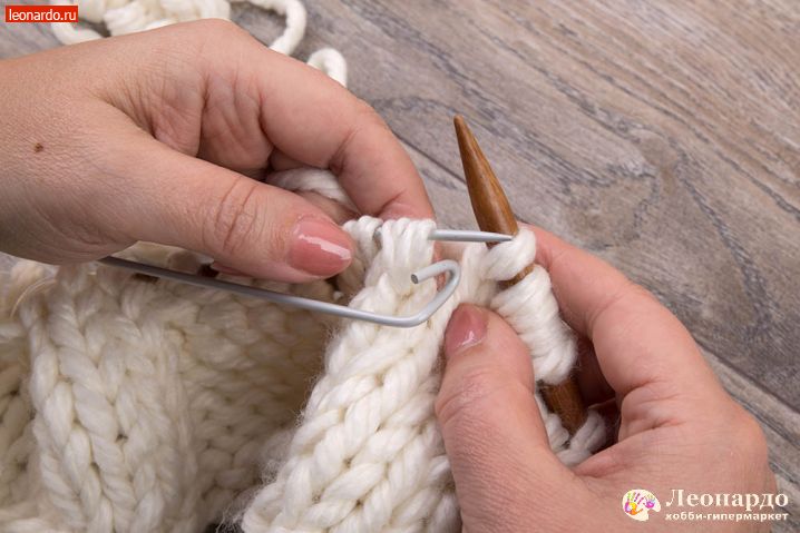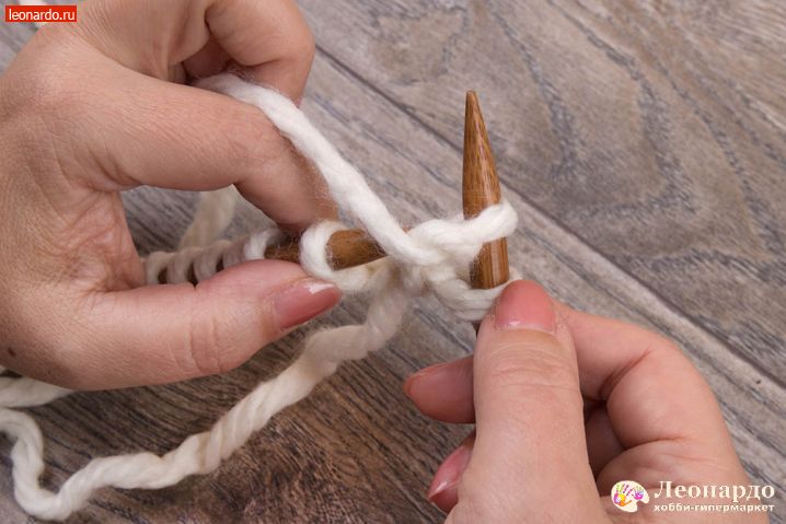 - Вводим иглу справа налево сквозь первую петлю на спице (рис. 1), протягиваем нить и спускаем петлю.