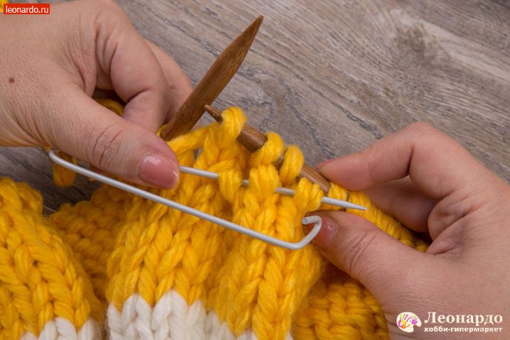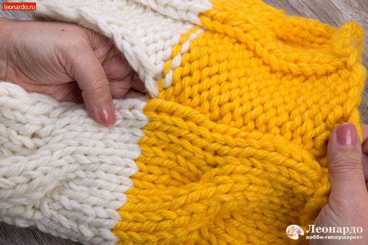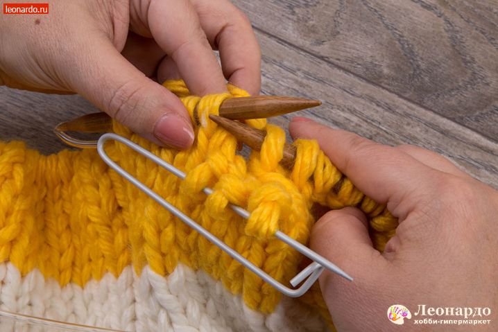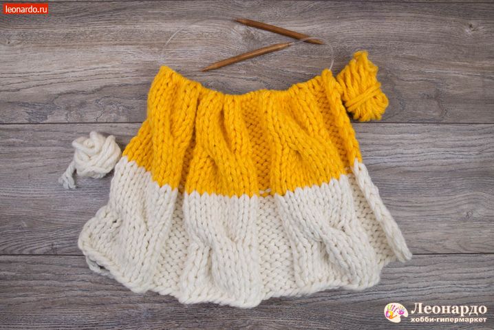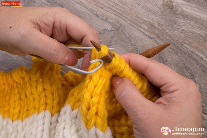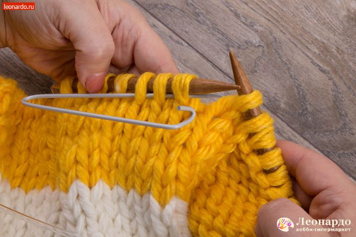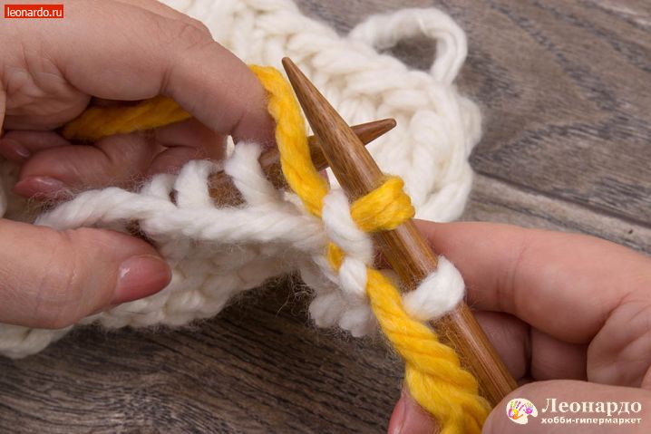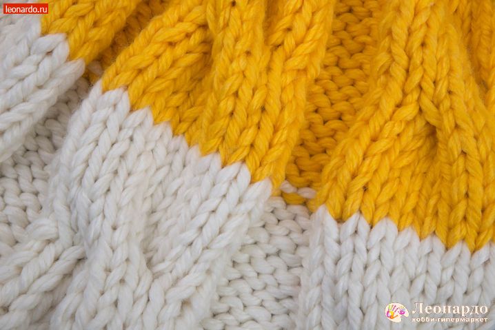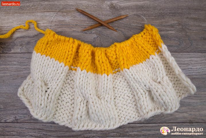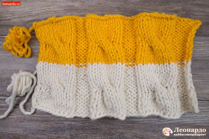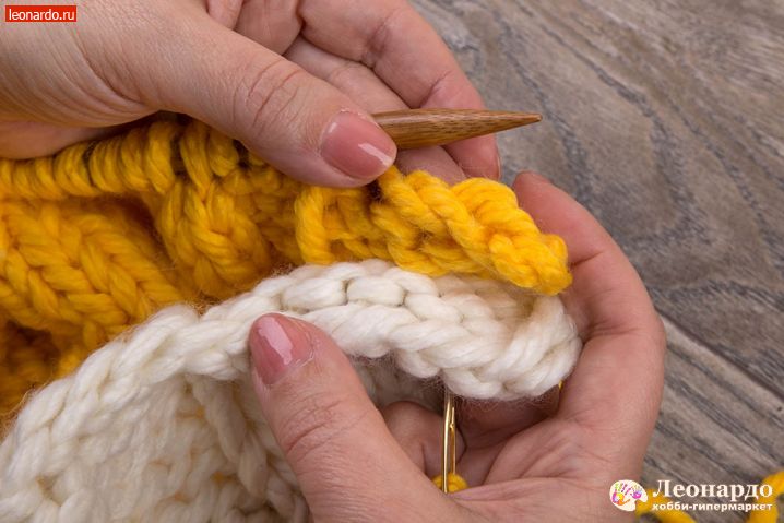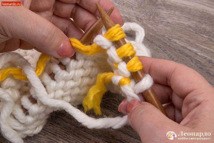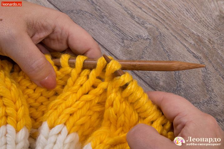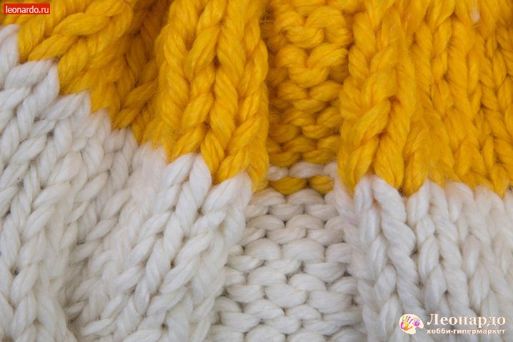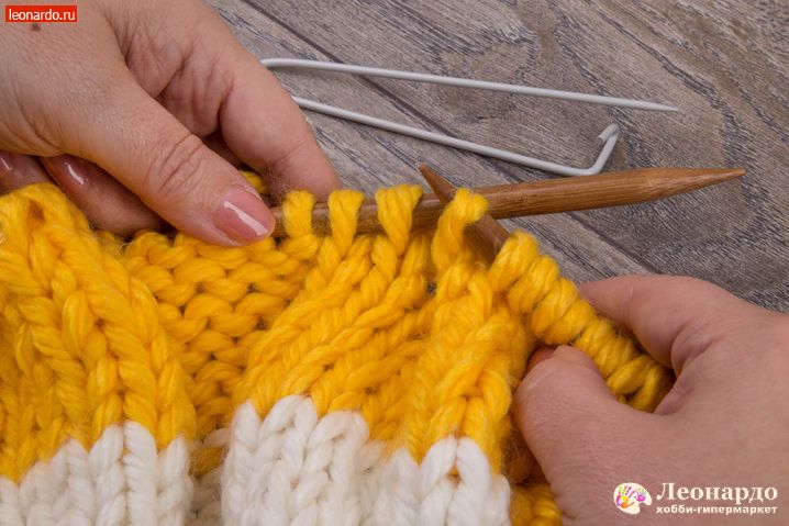 6. Присоединяем второй цвет. Для этого снимаем на спицу кромочную петлю, перекручиваем с нитью белого цвета нить желтого цвета и начинаем вязать 16 ряд пряжей ADELIA "FAST" (78% акрил, 22% шерсть, №03 желтый).