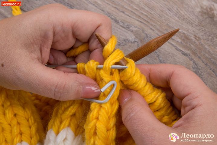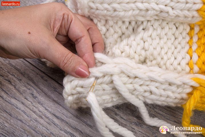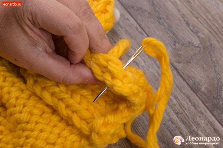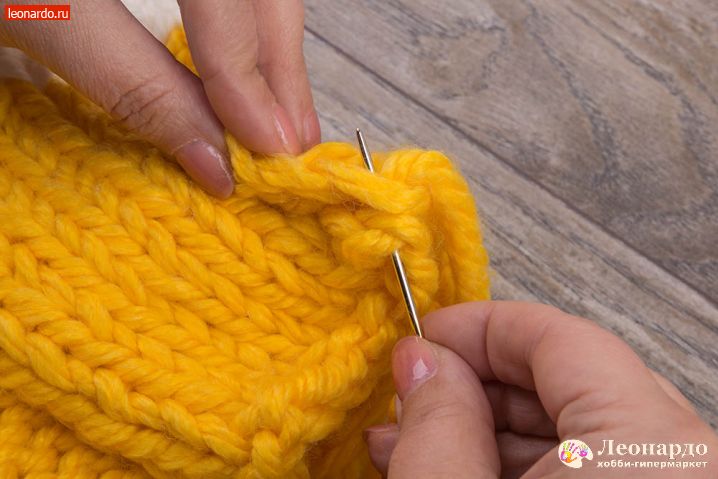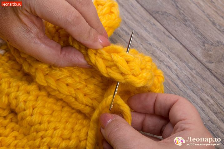 10. Обрезаем желтую нить, оставляя «хвост» около 2-х метров. Закрываем ряды согласно картинкам иглой GAMMA (арт. N-313); также можно использовать специальные иглы для сшивания вязаных изделий «Gamma» N-009.