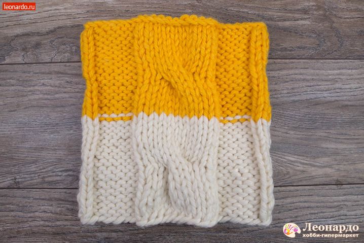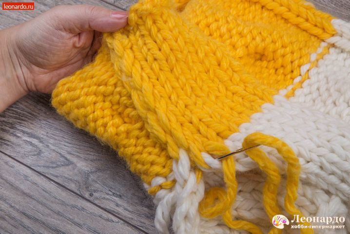 13. Выворачиваем снуд на изнаночную сторону, соединяем две коротких стороны и начинаем сшивать швом «назад иголка» оставшейся желтой нитью.