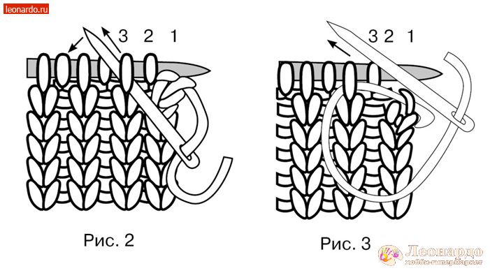 - Вводим иглу в петлю через одну (рис. 2), протягивая через нее нить, но при этом оставляем петлю на спице до тех пор, пока не будет закрыта предыдущая петля. Для этого вводим иглу справа налево в пропущенную петлю (рис. 3), протягивая сквозь нее нить и спускаем обе петли со спицы, через которые протянута нить.
