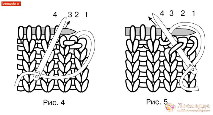 - Затем закрываем четвертую петлю, т.е. следующую петлю на спице. Для этого иглу снова вводим в последнюю спущенную со спицы петлю слева направо (рис. 4) и в последнюю спущенную петлю справа налево (рис. 5).