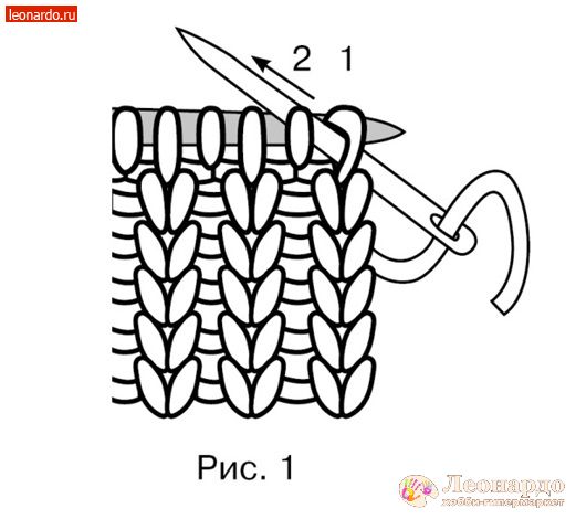 - Вводим иглу справа налево сквозь первую петлю на спице (рис. 1), протягиваем нить и спускаем петлю.