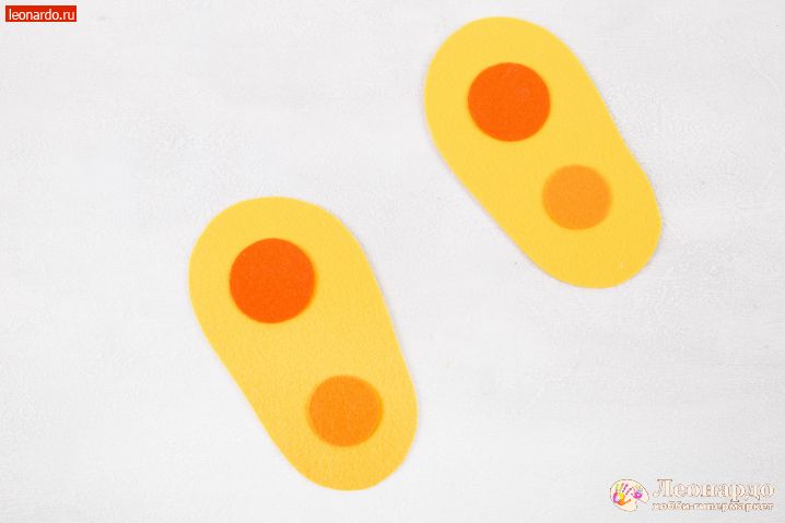 3. На будущих подошвах размещаем круги из оранжевого и тёмно-жёлтого фетра, которые будут не только украшать поверхность, но и предохранять её от скольжения.