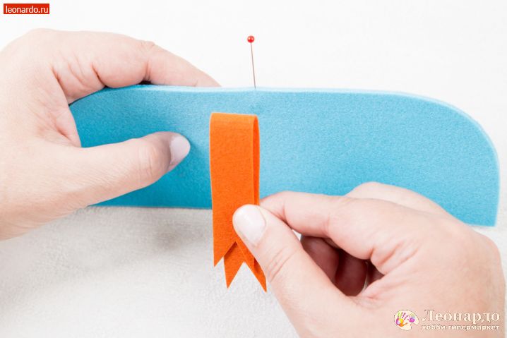 5. Из тёмно-оранжевого фетра вырезаем 2 полоски длиной 15 см и шириной 1,7 см, на концах которых ножницами GAMMA (арт. U-9016) делаем вырез, чтоб получился флажок.