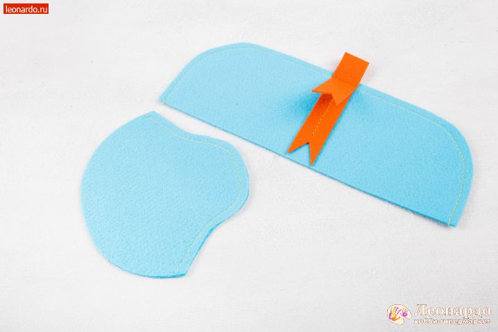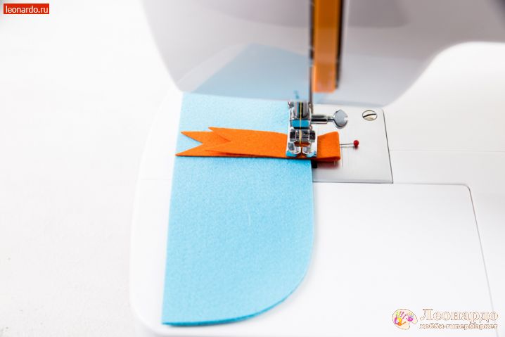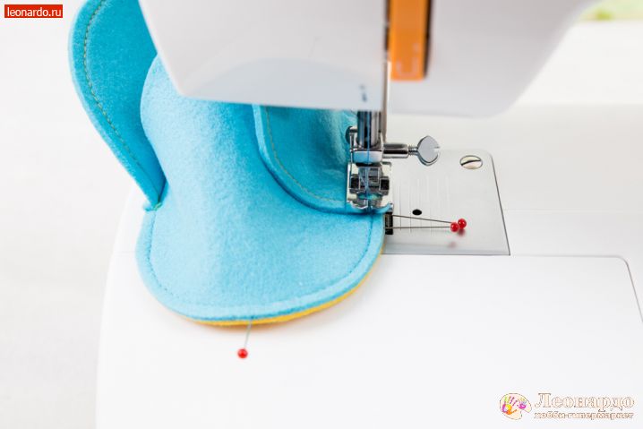 6. Каждую получившуюся деталь складываем пополам и прикалываем к задней части ботинка булавками GAMMA (арт.PH-010) таким образом, чтобы сгиб на 1,5 см выступал за край голубого фетра, и прокладываем на швейной машинке вдоль закруглённого края декоративную строчку.