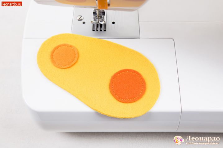 13. Другой – к заготовке для застёжки. Складываем обе детали из жёлтого фетра и сшиваем их по контуру, затем фиксируем швейной машинкой на тыльной стороне ботиночка.