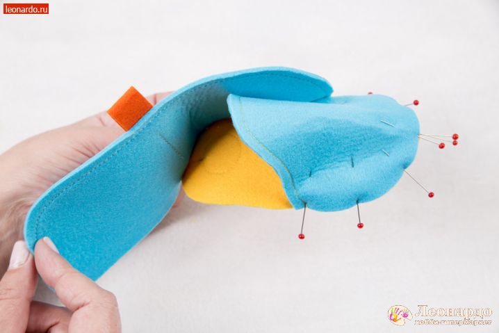16. Пришиваем к застёжке, добавляя сложенную пополам деталь из зелёного фетра.