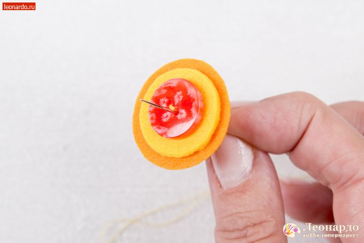 15. Соединяем круги и пуговицу GAMMA (арт. AY 9973) между собой, все детали прошиваем насквозь вручную с помощью иголки GAMMA N-310 (делаем необходимое количество стежков для крепкого сцепления).